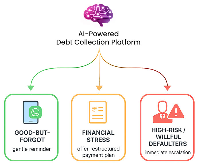 Channel Optimization: Does this borrower respond to SMS, WhatsApp, Email, IVR, or an AI based VoiceBot? AI knows the preferred channel, time of day, and even the right tone of voice.